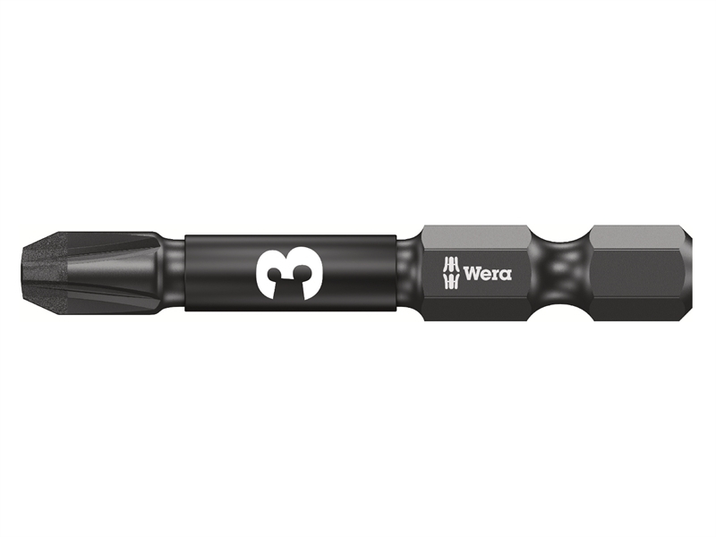 Wera Impaktor 50mm Pozi bits with 1/4in hexagon drive. Designed for use with all heavy-duty impact machines and can be used on any machine. The Impaktor technology ensures an above-average service life even under extreme conditions thanks to a best-possible utilisation of the material properties and optimally designed production methods and geometry. Particularly suitable for use with conventional impact drivers, the rough diamond coating eliminates damaging cam out from the screw head due to the enhanced frictional resistance.